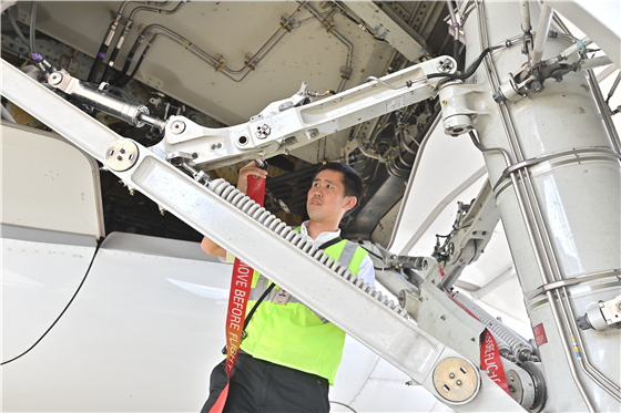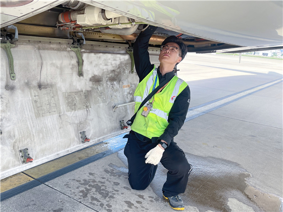 裘磊正在檢查飛機起落架插銷和機輪