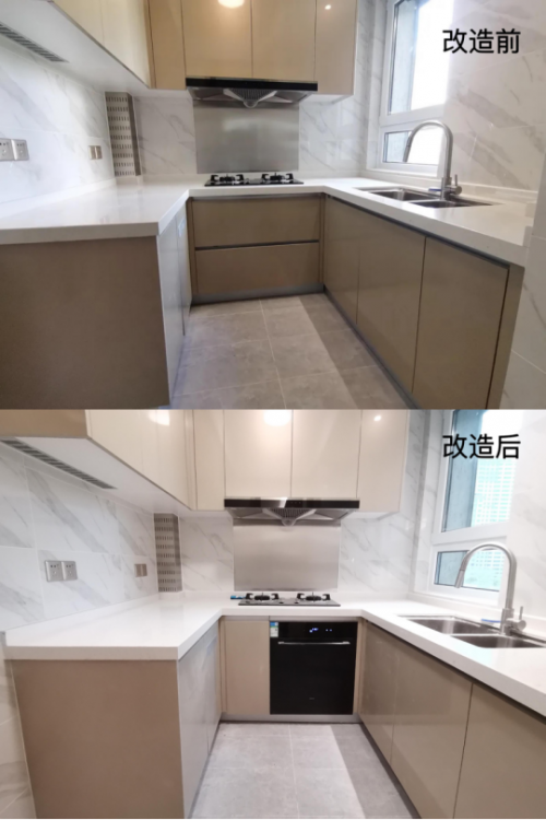 老板電器“無憂廚改”項(xiàng)目洗碗機(jī)改造效果,(上)改造前,(下)改造后