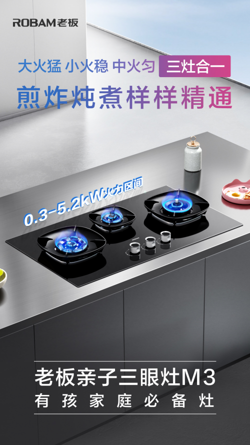 4月27日,老板電器在上海AWE2023展館舉辦“讓烹飪想象自由生長——老板電器數(shù)字廚電科技新品”發(fā)布會,重磅推出老板親子三眼灶M3 ,三個灶頭包含三種火力區(qū)間,不僅能同時烹飪多道菜,還可以輕松應(yīng)對輕量化小份量飲食,滿足全家多口味需求,完美解決有娃家庭的多種烹飪痛點。