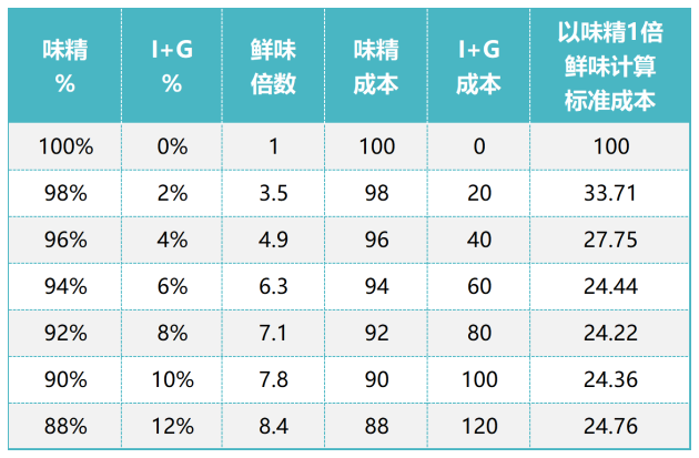 I+G與味精搭配的鮮味呈味倍數(shù)成本對照表