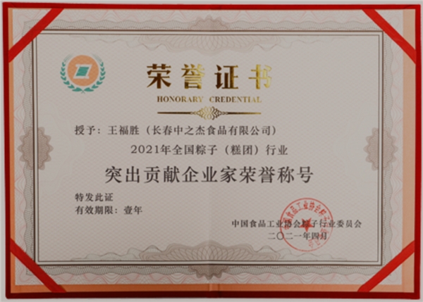有鑒于中之杰長(zhǎng)久以來(lái)對(duì)弘揚(yáng)粽子文化事業(yè)的貢獻(xiàn),在2021年,中之杰董事長(zhǎng)王福勝先生獲得機(jī)構(gòu)頒發(fā)的“突出貢獻(xiàn)企業(yè)家”稱號(hào),體現(xiàn)出中之杰在行業(yè)內(nèi)的領(lǐng)軍實(shí)力和頂流水平。王福勝還帶領(lǐng)中之杰分別榮獲 “長(zhǎng)春民營(yíng)經(jīng)濟(jì)突出貢獻(xiàn)企業(yè)”和“民營(yíng)經(jīng)濟(jì)突出貢獻(xiàn)企業(yè)家”等榮譽(yù)。同時(shí),王福勝還擔(dān)任中國(guó)食品工業(yè)協(xié)會(huì)粽子行業(yè)委員會(huì)會(huì)長(zhǎng)職務(wù),為行業(yè)發(fā)展盡職盡責(zé)。