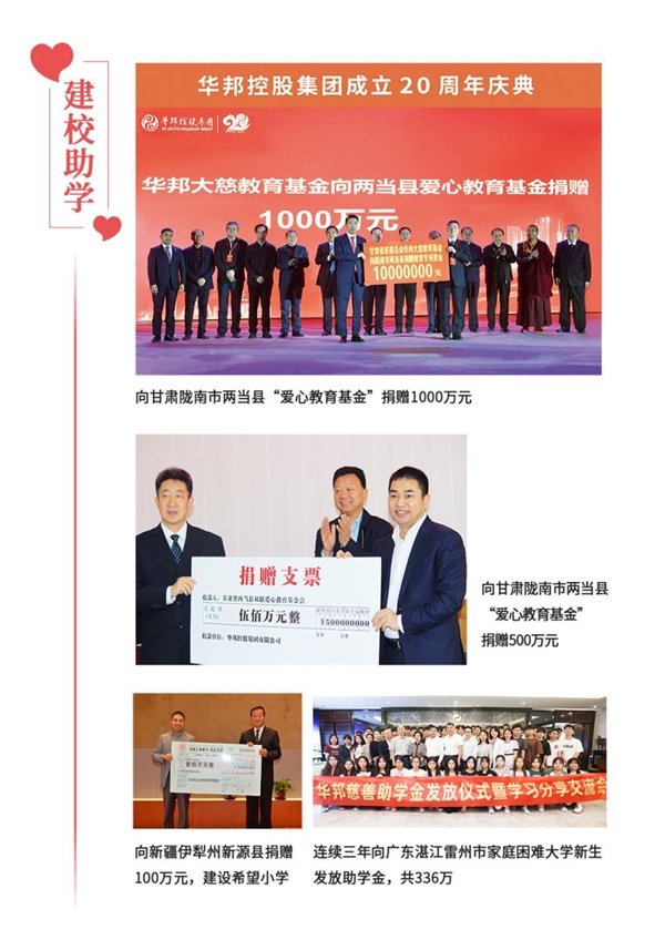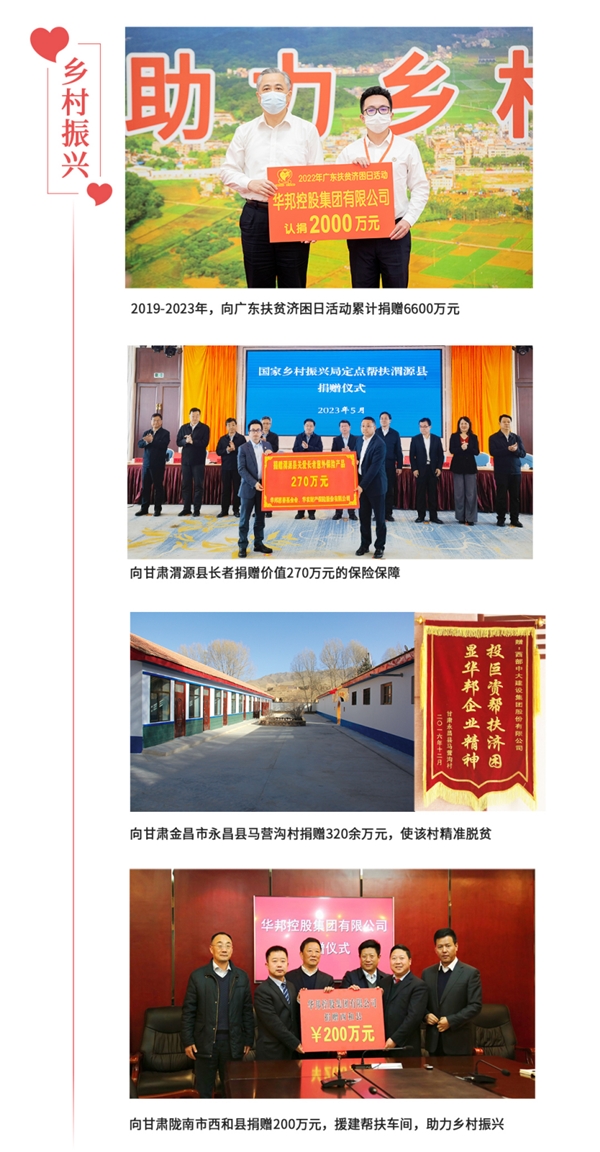 利合一,回報社會。23年來,華邦控股集團(tuán)不斷發(fā)展壯大,實現(xiàn)高質(zhì)量發(fā)展,得益于時代,得益于黨和政府及社會各界的關(guān)心與支持。助力鄉(xiāng)村振興,僅是華邦履行社會責(zé)任的縮影。華邦作為廣東省百強(qiáng)民營企業(yè),始終心懷感恩,勇于擔(dān)當(dāng),用心用情投身于各項慈善公益事業(yè),回饋社會。迄今為止,華邦在鄉(xiāng)村振興、建校助學(xué)、賑災(zāi)援助等公益領(lǐng)域累計捐款捐物數(shù)億元。