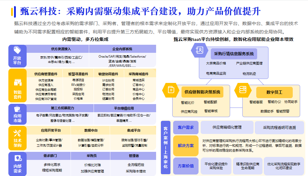 再例如,甄云科技通過全方位考慮采購的需求部門、采購者、管理者的根本需求來定制化開放平臺,實現(xiàn)供方資源接入和企業(yè)內(nèi)部系統(tǒng)的全局協(xié)同。