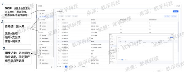歐孚科技運用低代碼技術(shù)搭建了“物資進-出項“管理模塊。該模塊包括搭建SKU庫,對物資物料進行統(tǒng)一定義;配置采購調(diào)度的表單公式,使區(qū)域站點能根據(jù)實際領(lǐng)用情況進行填寫;根據(jù)各站點領(lǐng)用數(shù)據(jù),快速統(tǒng)計物料成本并進行庫存盤點管理。