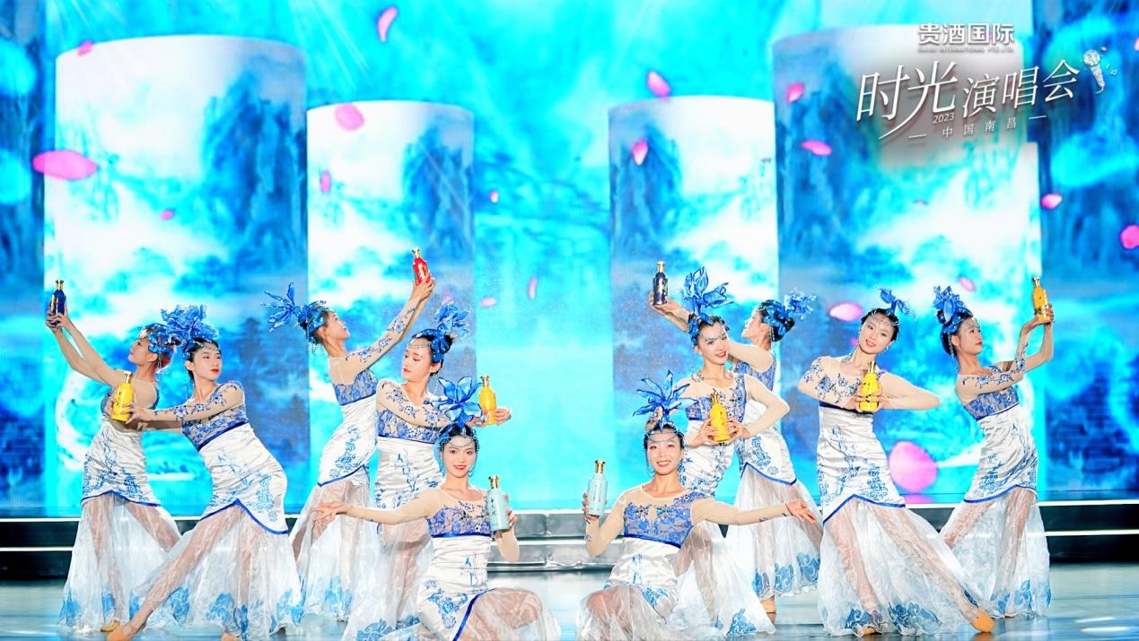 舞臺(tái)上,琥珀歲月,醉心時(shí)光,音樂穿越時(shí)空,喚起記憶的波瀾。演唱會(huì)以舞蹈《青花瓷》拉開序幕,舞者手中的青花瓷瓶,配合東方神韻的輕柔舞姿,這一切仿佛傾訴著貴酒國(guó)際對(duì)傳統(tǒng)文化的傳承與熱愛,將音樂與舞蹈的融合演繹得淋漓盡致。毛一涵、劉航、莫斯?jié)M、王強(qiáng)等依次登臺(tái),用歌聲跨越時(shí)光,共同體驗(yàn)音樂與時(shí)光交織的魅力。一場(chǎng)橫跨味覺與聽覺的盛會(huì),應(yīng)和滕王閣浩瀚雄姿?!队成郊t》、《紅旗飄飄》、《青藏高原》、《秋天不回來》等經(jīng)典旋律,讓現(xiàn)場(chǎng)觀眾感受到了濃郁的中國(guó)紅色文化與江西文化的底蘊(yùn)。觀眾們仿佛穿越時(shí)光,重溫那些難忘的年華,共同感懷著芳華歲月的美好回憶。