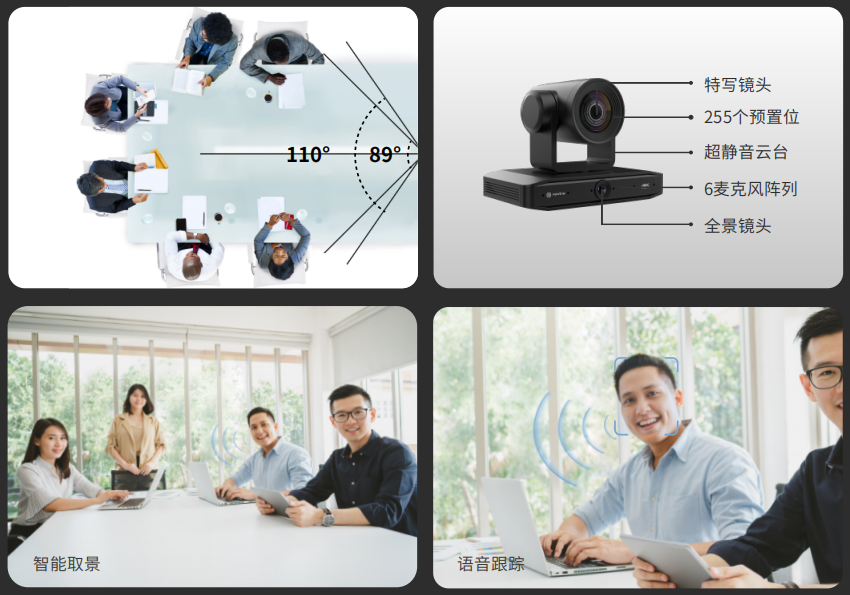 攝像系統(tǒng)由12倍光學(xué)變焦特寫鏡頭和110°大廣角的全景鏡頭組成,特寫鏡頭可視角達89°,可將畫面無損放大至12倍,加上自動對焦,不僅能捕捉所有參會人的表情和動作,會議室中的文件和白板內(nèi)容都能在遠端輕松觀看。同時,作為一款會議云臺攝像頭,它能通過6顆麥克風(fēng)陣列,鎖定發(fā)言人位置,電機實時穩(wěn)定安靜快速地運行轉(zhuǎn)動到當(dāng)前發(fā)言人,覆蓋會議室多個角度,讓遠程的參會人更具沉浸感和參與感。