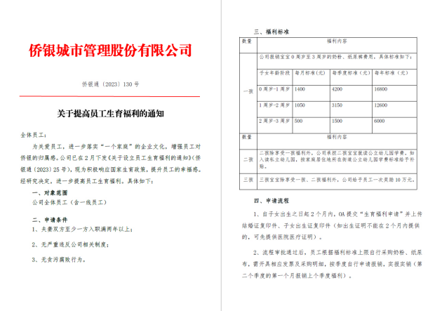 近日,一份僑銀股份新出臺的《關(guān)于提高員工生育福利的通知》流出,瞬間爆火全網(wǎng)引發(fā)熱議,網(wǎng)友紛紛大呼“神仙公司還招人嗎?”“報(bào)上地址,讓我來!”