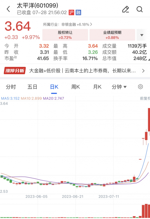 同時,太平洋證券稱,公司股票在2023年7月25日、7月26日、7月27日連續(xù)三個交易日內收盤價格漲幅偏離值累計達到20%,屬于股票交易異常波動情形。