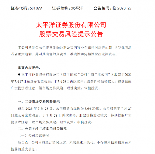 7月28日,太平洋證券發(fā)布股票交易風險提示公告,公司股票于2023年7月27日觸及異常波動后,于7月28日再次漲停,股票價格波動較大,特別提醒廣大投資者注意二級市場交易風險,理性決策,審慎投資。