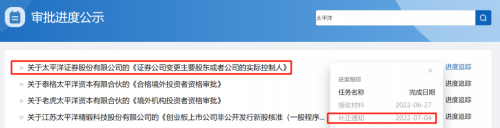 證監(jiān)會政務服務平臺顯示,太平洋證券主要股東或者公司的實控人變更仍處于補正通知狀態(tài),該狀態(tài)的完成日期為“2022-07-04”,接收材料時間為“2022-06-27”。