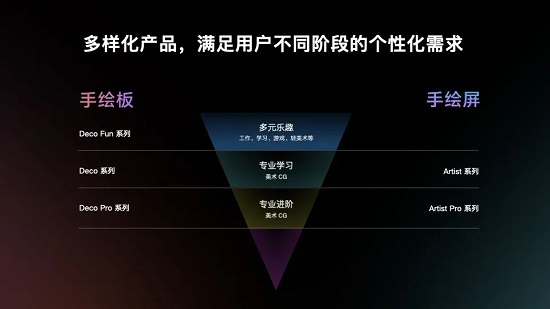 目前,XPPen 共有 2 大品類,5 大系列產(chǎn)品,包括數(shù)位板類的 Deco Fun、Deco、Deco Pro 系列及數(shù)位屏類 Artist、Artist Pro 系列產(chǎn)品。其中,Deco Fun 產(chǎn)品線系列面向多元樂趣用戶;Deco 和 Artist 產(chǎn)品線系列面向?qū)I(yè)學(xué)習(xí)用戶;Deco Pro 和 Artist Pro 產(chǎn)品線系列面向?qū)I(yè)進(jìn)階用戶。全新的產(chǎn)品布局,可針對(duì)不同成長階段的用戶需求,打造從興趣入門到專業(yè)學(xué)習(xí)再到專業(yè)進(jìn)階的產(chǎn)品矩陣。
