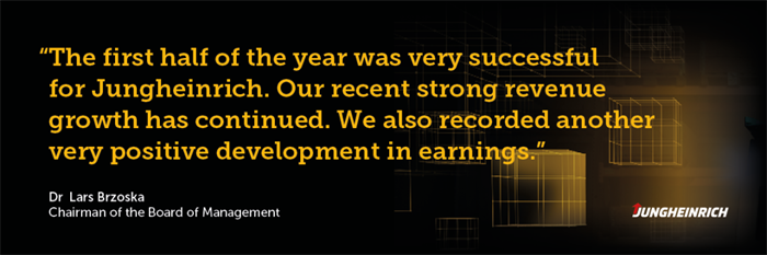 永恒力集團(tuán)董事會主席Lars Brzoska博士解釋道:“今年上半年對永恒力而言可謂碩果累累。我們延續(xù)了近期營業(yè)收入強(qiáng)勁增長的勢頭。增幅達(dá)到了46%,我們在盈利方面再次實(shí)現(xiàn)了極為喜人的增長。通過收購Storage Solutions集團(tuán),我們在美國貨架系統(tǒng)和倉儲自動化領(lǐng)域贏得了一個重要的增長點(diǎn)。這一點(diǎn)目前已首次體現(xiàn)在集團(tuán)的合并財(cái)務(wù)報(bào)表內(nèi)。我們繼續(xù)推進(jìn)實(shí)施2025+戰(zhàn)略,并確認(rèn)本年度的預(yù)測數(shù)據(jù)。永恒力已經(jīng)為迎接未來做好了充分的準(zhǔn)備。”