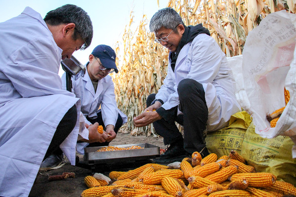 中國農(nóng)業(yè)科學(xué)院作物栽培與生理創(chuàng)新團隊首席專家李少昆研究員(右一)在通遼市開魯縣一處千畝片示范田開展工作。記者 連振 攝