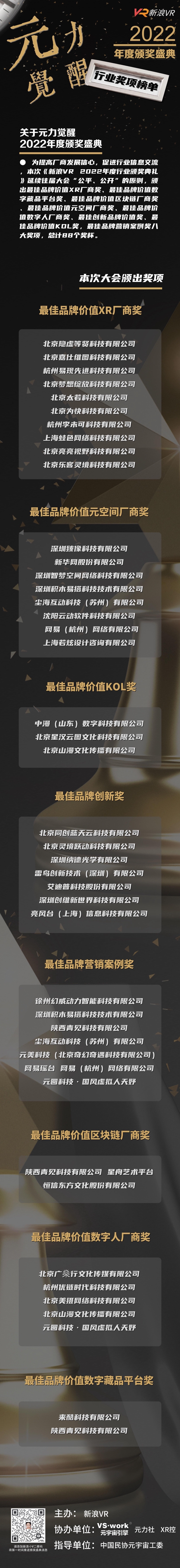 為提高廠(chǎng)商發(fā)展信心,促進(jìn)行業(yè)信息交流,本次《新浪VR 2022年度行業(yè)頒獎(jiǎng)典禮》延續(xù)往屆大會(huì)“公平、公開(kāi)”的原則,頒出最佳品牌價(jià)值XR廠(chǎng)商獎(jiǎng)、最佳品牌價(jià)值數(shù)字藏品平臺(tái)獎(jiǎng)、最佳品牌價(jià)值區(qū)塊鏈廠(chǎng)商獎(jiǎng)、最佳品牌價(jià)值元空間廠(chǎng)商獎(jiǎng)、最佳品牌價(jià)值數(shù)字人廠(chǎng)商獎(jiǎng)、最佳創(chuàng)新品牌價(jià)值獎(jiǎng)、最佳品牌價(jià)值KOL獎(jiǎng),最佳品牌營(yíng)銷(xiāo)案例獎(jiǎng)八大獎(jiǎng)項(xiàng),總計(jì)44個(gè)數(shù)字獎(jiǎng)杯。