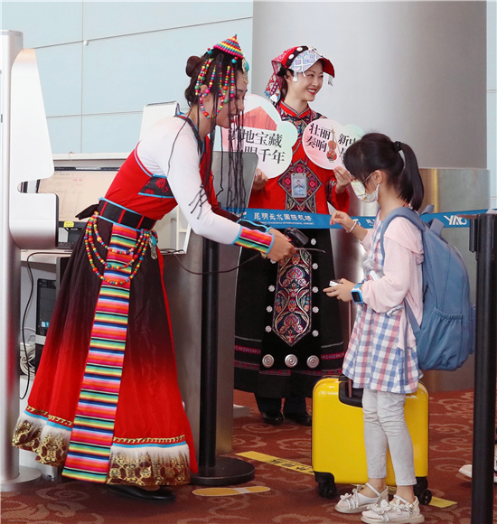 首航當天,東航工作人員身著少數(shù)民族服裝,用親切的民族方言向旅客問好,引導旅客辦理乘機手續(xù)。主題航班專屬柜臺前,頗有云南歷史文化元素的海報引得旅客駐足觀看,“媽媽,這是我們在西雙版納看到過的孔雀嗎?”“哇,你看,這是大鵬金翅鳥,我在云南省博物館見到過?!毙÷每蛷霓k理值機就開始期待這趟精彩的空中博物館之旅。
