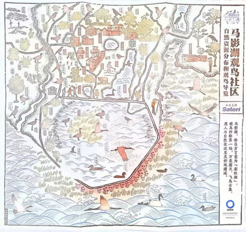 在這個書屋中,項目團隊別出心裁地規(guī)劃了一個叫“漢字與鳥”的板塊,包含了從甲骨文到現(xiàn)代所有與鳥相關(guān)的漢字。緊鄰這個板塊的墻上是一整排純手工制作的傳統(tǒng)卷軸,里面寫滿了與鳥相關(guān)的千古名句。位于大廳正中央的是一幅巨型馬影湖手繪地圖,上面標(biāo)注著當(dāng)?shù)刂饕暮蝤B種類,供參觀者學(xué)習(xí)。