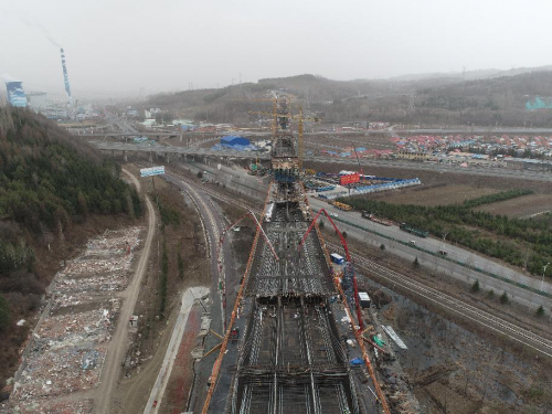 圖為沈白高鐵建設(shè)中的白山渾江特大橋,該橋是全線控制性工程,全橋長(zhǎng)1499.5米,全橋共有鉆孔樁588根,橋墩臺(tái)56個(gè),大跨度連續(xù)梁3個(gè),道岔連續(xù)梁1個(gè),正在澆筑混凝土的是道岔連續(xù)梁和10號(hào)墩0#塊。該橋先后跨越渾江、輝臨高速公路及G201國(guó)道,涉臨近鐵路既有線施工,安全風(fēng)險(xiǎn)高,施工難點(diǎn)多。