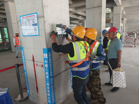 競賽結(jié)束后,開展了新站醫(yī)院項目施工現(xiàn)場安全質(zhì)量觀摩活動。觀摩人員對觀摩項目采用的“鍍鋅盤扣+鋼板網(wǎng)”防護體系、鍍鋅盤扣內(nèi)支撐架體系的安全性等展開了積極討論,并給予高度評價,對項目采取的“三區(qū)”(防墜區(qū)、走道區(qū)、料場區(qū))分離的超前策劃以及“三色聚氨酯”“混凝土攔茬”等創(chuàng)新技術(shù)應(yīng)用進行了深入了解。