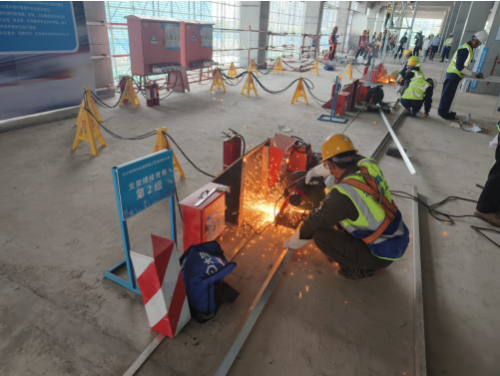 隨著一聲哨響,比賽正式開始,四個比賽項目的參賽隊員迅速行動、各亮絕活,在同等條件下進行工效、工藝、操作規(guī)程等多方面比拼。在砌筑比賽中,選手根據(jù)規(guī)則,通過識圖、排版放樣、測量、勾縫、清潔等步驟,完成最終作品,整個過程一氣呵成;在支架焊接比賽中,“悍將們”一手拿防護面罩,一手持電焊槍,仔細打磨、配對、焊接,完成比賽項目;在支撐架搭設(shè)比賽中,選手們安全帽、防滑鞋佩戴整齊,安全帶系掛牢靠,嚴格遵守安全規(guī)范要求,每一個步驟都安全有序……整個比賽現(xiàn)場一片忙而不亂的景象,再現(xiàn)了建筑工地日常忙碌的施工場景。