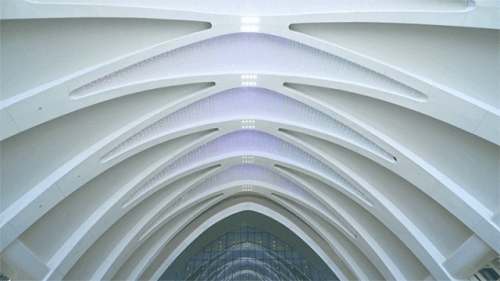 登錄廳“鳥喙”造型凈高34m,頂端懸挑長度達到6m。梁柱縱橫交錯、網(wǎng)狀交織。八局裝飾采用裝配式設(shè)計施工方法,現(xiàn)場組裝、單元吊裝、多條安裝線流水施工,完成1400塊雙曲異形超長鋁板快速安裝,輔以9953盞Dmax-512系統(tǒng)RGBW調(diào)光燈,營造流光溢彩的視覺效果,讓建筑空間更具藝術(shù)特性。