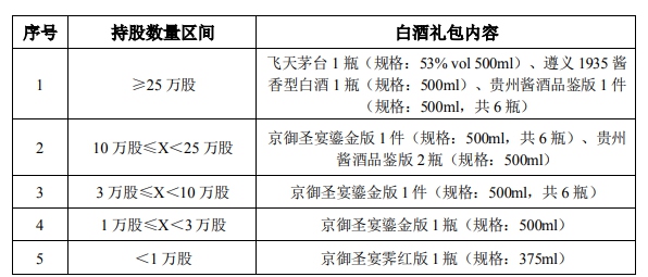根據(jù)活動安排,吉宏股份持股25萬股以上的股東收到的白酒禮包將包括:飛天茅臺1瓶(規(guī)格:53%?vol?500ml)、遵義1935醬香型白酒1瓶(規(guī)格:500ml)、貴州醬酒品鑒版1件(規(guī)格:500ml,共6瓶)。