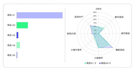 具體到5A維度,商品A1與A2聚焦用戶商品曝光行為,商品A3聚焦用戶的商品主動行為,如商品點擊、收藏、加購等,商品A4、A5則更側(cè)重抖音域內(nèi)用戶的商品購買和復(fù)購行為,通過科學(xué)的分層,清晰呈現(xiàn)指定商品在抖音域內(nèi)的種草與轉(zhuǎn)化效率。