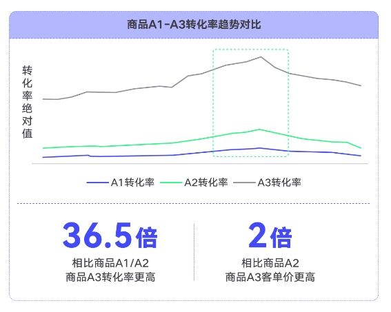 此外,商品5A從生意結(jié)果出發(fā),建立了人群商品行為和生意的關(guān)聯(lián)。其中,商品A3的樞紐價值尤其值得關(guān)注。相比商品A1/A2,商品A3的轉(zhuǎn)化率高出36.5倍;相比商品A2,商品A3的客單價高出2倍。這意味著在抖音生態(tài)內(nèi),商品A3人群對商品的喜愛程度更高,且更愿意購買該商品。品牌商家可以重點錨定商品A3人群進(jìn)行種草,放大營銷效果,在市場競爭中占據(jù)優(yōu)勢。