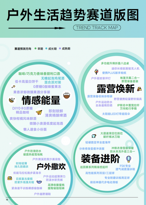 巨量算數(shù) & 算數(shù)電商研究院綜合趨勢賽道評(píng)估模型,篩選出了 38 個(gè)戶外生活行業(yè)趨勢賽道,覆蓋運(yùn)動(dòng)用品、戶外用品、箱包、方便食品、酒飲等多板塊,我們認(rèn)為推動(dòng)品類的創(chuàng)新力集中在功能創(chuàng)新、場景創(chuàng)新和情感創(chuàng)新。