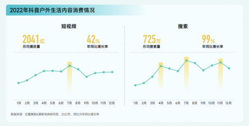 2022年戶外生活相關(guān)內(nèi)容在抖音上的受歡迎程度持續(xù)增長,月均播放量高達(dá) 2041 億次,同比增長 42%。除短視頻種草外,用戶主動(dòng)搜索戶外生活內(nèi)容的意愿也更加強(qiáng)烈,月均搜索量達(dá)到 725 萬次,同比增長 99%。