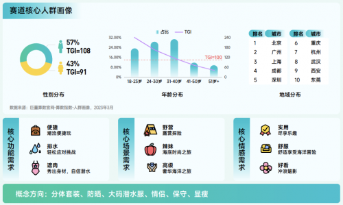 沖浪賽道解讀:2022年搜索量同比增長100.7% 。用戶以男性為主,集中在北上廣一線城市。24-40 歲人群對(duì)沖浪潛水更感興趣。相對(duì)來說,對(duì)于沖浪潛水用戶更注重便捷、排水等功能。未來,隨著技術(shù)的發(fā)展和人們對(duì)海洋環(huán)境保護(hù)意識(shí)的增強(qiáng),沖浪運(yùn)動(dòng)將更加注重舒適、安全和環(huán)保,并可能推出更具創(chuàng)新性的裝備,產(chǎn)生新的活動(dòng)形式。