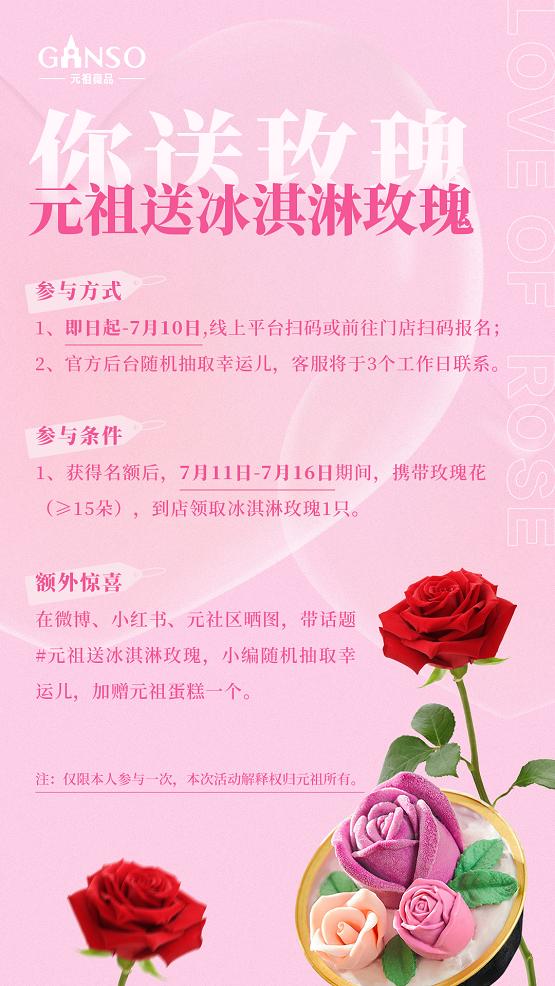 即日起至7月10日,線上平臺(tái)掃碼或前往元祖門店掃碼報(bào)名即可參與。官方后臺(tái)會(huì)隨機(jī)抽取幸運(yùn)兒,獲得名額后7月11日-7月16日攜玫瑰花到店領(lǐng)取冰淇淋玫瑰,為愛人獻(xiàn)上夏日專屬的甜蜜美味。參與活動(dòng)后,在微博、小紅書、元社區(qū)曬圖,帶話題#元祖送冰淇淋玫瑰#,還有機(jī)會(huì)獲得元祖蛋糕一個(gè)。