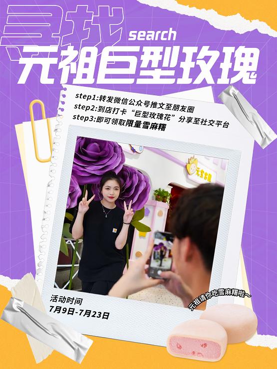 7月9日-7月23日,轉(zhuǎn)發(fā)元祖食品官方微信公眾號(hào)巨型玫瑰活動(dòng)推文,并到店尋找“巨型玫瑰花”,拍照打卡分享至社交平臺(tái)(小紅書、抖音、微博等),即可領(lǐng)取限量雪麻糬,超多驚喜福利,點(diǎn)燃夏日激情。