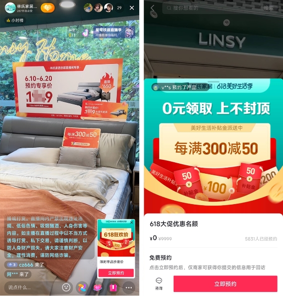 為此,在大促期間,林氏家居特意通過(guò)凸顯活動(dòng)優(yōu)惠的多種物料增加直播間大促氛圍 ,利用一目了然的優(yōu)惠信息吸引用戶駐足,借助包括商品介紹、稀缺性優(yōu)惠劵推介等標(biāo)準(zhǔn)化、模塊化的直播話術(shù),強(qiáng)調(diào)活動(dòng)優(yōu)惠信息,加速產(chǎn)品種草,引導(dǎo)用戶領(lǐng)取優(yōu)惠進(jìn)行留資,線下到店購(gòu)買商品。