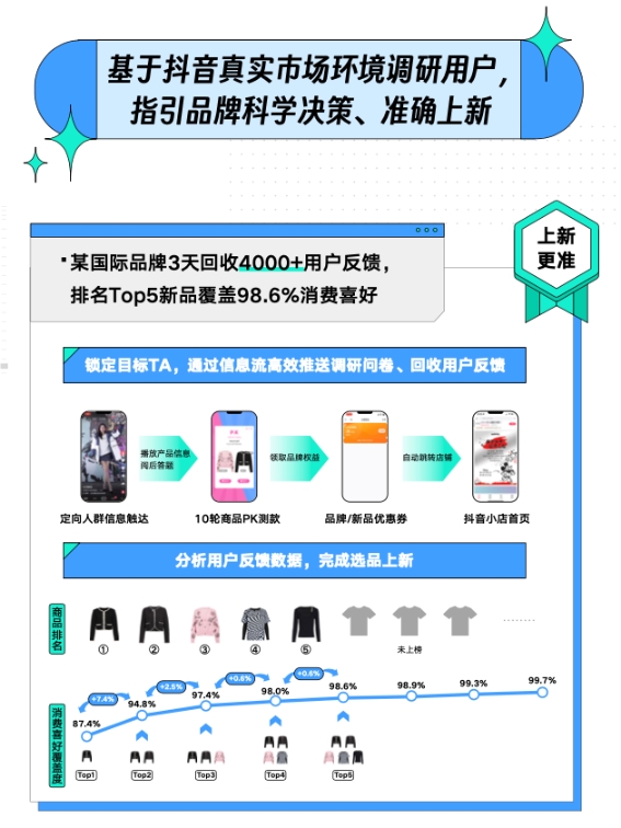 某國際服裝品牌在選品上新時(shí)使用巨量云圖“新品實(shí)驗(yàn)室”的測品能力,僅用時(shí)三天就回收了超過4000份目標(biāo)用戶反饋,選出的貨品,也成為后續(xù)品牌直播間銷量冠軍,為店鋪GMV的主力貢獻(xiàn)商品。獲得這樣的上新成績是因?yàn)榫蘖吭茍D在測品的每個(gè)細(xì)節(jié)都試圖降低誤差,從而最大程度還原消費(fèi)者真實(shí)意愿。