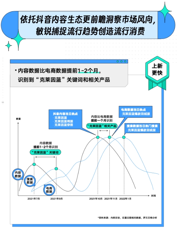 看似無序的消費(fèi)決策遵循一套基礎(chǔ)邏輯,比如購買普遍發(fā)生在瀏覽和搜索之后。所以,內(nèi)容數(shù)據(jù)和搜索數(shù)據(jù)可以被視為交易的前置指標(biāo),它們能夠更早預(yù)測未來交易走向。正是基于這一結(jié)論,擁有內(nèi)容場監(jiān)測能力的巨量云圖能更快識別出新品市場機(jī)會,為品牌上新提供參考。