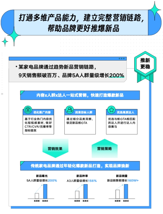 如果說前期洞察和測品是成功的基石,那么能否應(yīng)對上市后的這些問題,決定了新品可否走好成功前的最后一里路。在「新品C位出道指南」中,巨量云圖場景運(yùn)營模塊下的「趨勢新品營銷」等功能讓品牌推新更穩(wěn)健。