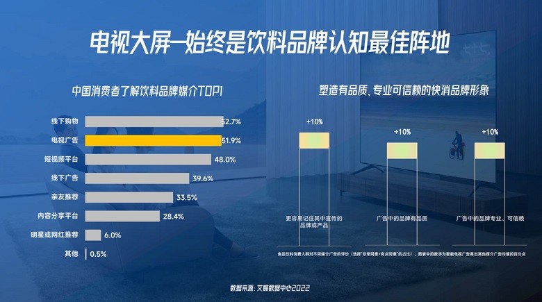 根據(jù)艾媒數(shù)據(jù)中心2022的統(tǒng)計分析,電視廣告是中國消費者了解飲料品牌的第一媒介,是建設(shè)飲料品牌認(rèn)知的最佳陣地,有助于塑造高品質(zhì)、可信賴的品牌形象。