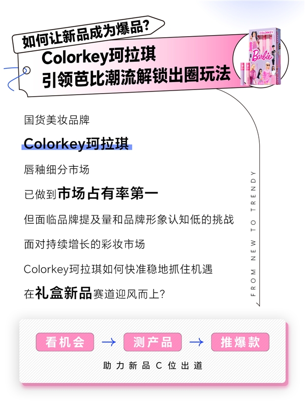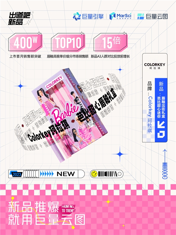適用于送禮、提升品牌調(diào)性、具有高客單價(jià)特征的“芭比禮盒”新品,符合品牌風(fēng)格特點(diǎn)和消費(fèi)需求,適宜作為品牌形象款進(jìn)行主推和破圈?;诖?珂拉琪打造高客單價(jià)“芭比甜心迷你唇釉出街禮盒”作為618活動(dòng)的主推新品,強(qiáng)力吸引目標(biāo)人群。