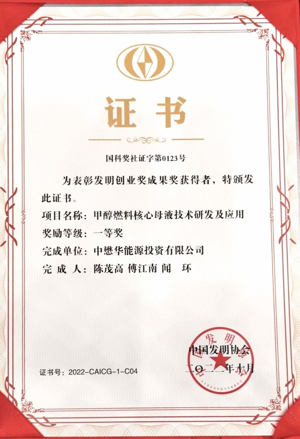 4月25日,由中國發(fā)明協(xié)會、科技日報社、國家科學(xué)技術(shù)獎勵工作辦公室、中國知識產(chǎn)權(quán)報社共同舉辦的第十七屆中國發(fā)明家論壇暨發(fā)明創(chuàng)業(yè)獎頒獎典禮在京舉行。第十屆全國人大常委會副委員長、中國關(guān)心下一代工作委員會主任顧秀蓮,科學(xué)技術(shù)部黨組成員、副部長,中國發(fā)明協(xié)會理事長吳朝暉,國家知識產(chǎn)權(quán)局專利局副局長王嵐?jié)阮I(lǐng)導(dǎo)出席為獲獎代表頒獎。會上由中懋華能源投資有限公司完成的“甲醇燃料核心母液技術(shù)研發(fā)及應(yīng)用”技術(shù)成果榮獲發(fā)明創(chuàng)業(yè)獎成果獎一等獎,中懋華能源投資有限公司董事長陳茂高作為獲獎代表出席頒獎典禮。