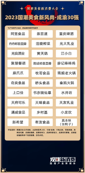 國潮品牌之夜是一場專屬中國美食品牌的加冕之夜。在借由盛典彰顯國潮美食風(fēng)尚之余,觀潮新消費還發(fā)布了《2023國潮美食新風(fēng)尚·成渝30強》,旨在打造成渝核心企業(yè)標桿,描繪區(qū)域食品工業(yè)發(fā)展藍圖,為進一步推動企業(yè)創(chuàng)新、深化產(chǎn)業(yè)合作、實現(xiàn)成渝經(jīng)濟高質(zhì)量發(fā)展提供參考。