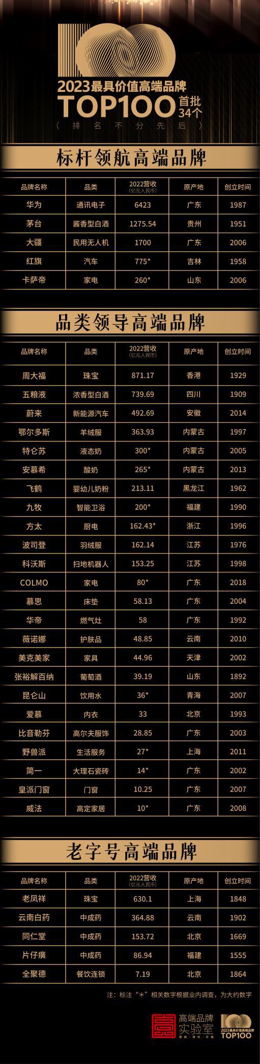 這份擁有34個品牌的榜單分為三類:標(biāo)桿領(lǐng)航品牌榜、品類領(lǐng)導(dǎo)品牌榜和老字號品牌榜。發(fā)布方表示,首批標(biāo)桿領(lǐng)航品牌榜有5個品牌入圍:華為、茅臺、卡薩帝、大疆、紅旗。它們的入圍標(biāo)準(zhǔn)是:擁有全球化的經(jīng)營和影響力、100億以上的營收規(guī)模和公認(rèn)的高端市場地位?!袄献痔柶放瓢瘛钡耐瞥鲋荚谥С种袊献痔柶放频慕ㄔO(shè),入選的五個品牌——老鳳祥、云南白藥、同仁堂、片仔癀、全聚德,顯示中華老字號擁有廣闊的品牌建設(shè)空間。至于品類領(lǐng)導(dǎo)品牌則囊括了近20多個細(xì)分行業(yè)(品類)的24個領(lǐng)導(dǎo)品牌,它們基本是這些細(xì)分行業(yè)的品類冠軍。