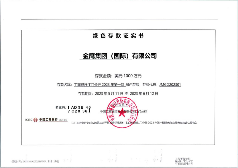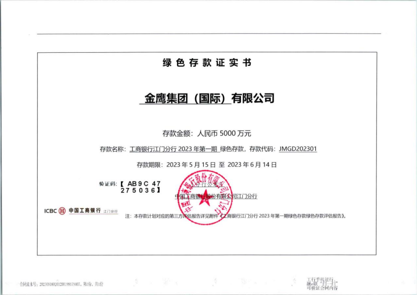 根據(jù)工商銀行江門分行的綠色存款產(chǎn)品計劃書,金鷹集團的綠色存款將主要投放到污水處理類(污水處理及收集)項目、資源綜合利用類(生活垃圾焚燒發(fā)電)項目及其他符合規(guī)定條件的綠色產(chǎn)業(yè)項目。上述項目,均已通過獨立第三方專業(yè)認(rèn)證機構(gòu)——中誠信綠金科技(北京)有限公司鑒定。此外,工商銀行江門分行每半年定期向金鷹集團提供《綠色存款評估報告》,通過詳細數(shù)據(jù)追蹤資金使用情況,確保綠色存款專用于綠色項目。