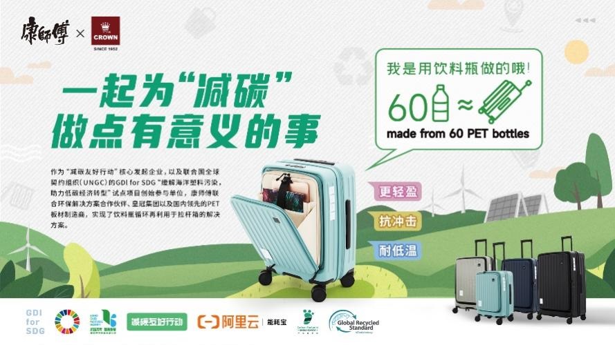 康師傅還作為主要發(fā)起單位之一攜手聯(lián)合國全球契約組織(UNGC)共同發(fā)起了GDI for SDG(全球發(fā)展倡議助力可持續(xù)發(fā)展目標)的首個試點項目——“緩解海洋塑料污染,助力低碳經(jīng)濟轉型”,與合作伙伴一道將回收的PET等使用后塑料制品,再造為多種生活消費品,又通過電商平臺的銷售推廣,實現(xiàn)循環(huán)利用。在前不久的世界地球日,康師傅與環(huán)保解決方案合作伙伴共創(chuàng),實現(xiàn)了用康師傅廢棄飲料瓶制作拉桿箱、野餐墊、收納盒等環(huán)保周邊產(chǎn)品。其中聯(lián)合旅行箱品牌CROWN皇冠,共同推出環(huán)保旅行箱,也是在電商很受追捧,成為第一個商業(yè)化的rPET項目。由于應用了專利技術,旅行箱使用的回收塑料量大,比現(xiàn)有材料更環(huán)保,而且品質更好,無異味,更耐沖擊,耐低溫。這個項目實現(xiàn)了從塑料循環(huán)利用到商業(yè)價值鏈的良性循環(huán),讓業(yè)界看到循環(huán)經(jīng)濟模式的曙光。
