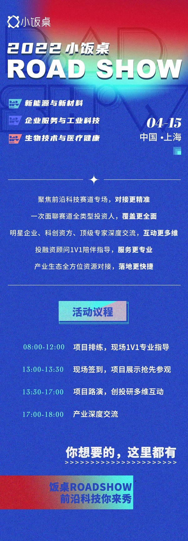 導語:4月15日,2022小飯桌ROASHOW將登陸上海,將開設“新能源與新材料”、“企業(yè)服務與工業(yè)科技”、“生物技術與醫(yī)療健康”賽道專場路演,歡迎各位優(yōu)秀的科技創(chuàng)業(yè)者前來應戰(zhàn)!