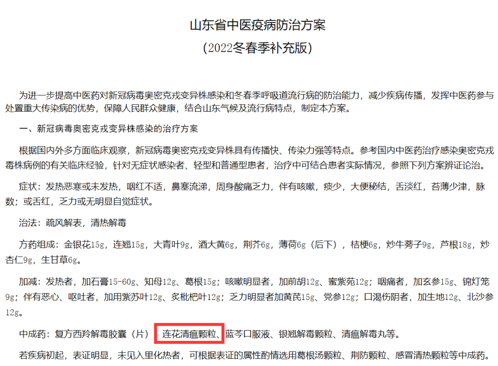連花清瘟從2003年進(jìn)入市場至今,已經(jīng)獲得國家層面20余次方案推薦,從甲型流感、乙型流感、禽流感到新型冠狀病毒性肺炎,在這十幾年我國發(fā)生的病毒傳染性重大公共衛(wèi)生事件中,連花清瘟都獲得了治療方案的推薦,成為治感冒、防流感、治療新冠肺炎代表性中成藥。2022年1月《山東省中醫(yī)疫病防治方案(2022冬春季補(bǔ)充版)》中將“連花清瘟顆?!绷袨樾鹿诓《緤W密克戎變異株感染的治療方案推薦中成藥。