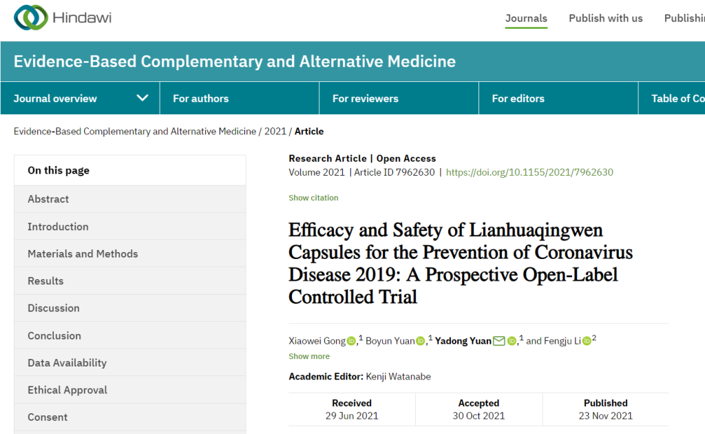 中成藥連花清瘟預(yù)防新冠肺炎研究取得重要進(jìn)展。近日,由中國河北醫(yī)科大學(xué)第二醫(yī)院呼吸與危重癥醫(yī)學(xué)科、武警河北總隊(duì)醫(yī)院醫(yī)學(xué)影像科共同撰寫的科研論文《連花清瘟膠囊預(yù)防新型冠狀病毒肺炎的有效性和安全性研究:前瞻性開放標(biāo)簽對照試驗(yàn)》于近日在國際期刊《循證補(bǔ)充和替代醫(yī)學(xué)》發(fā)表,揭示出連花清瘟在預(yù)防新冠感染中的作用,引發(fā)學(xué)界廣泛關(guān)注。