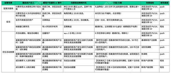 我們梳理了三種運(yùn)營(yíng)場(chǎng)景,對(duì)于未參與過(guò)轉(zhuǎn)介紹活動(dòng)的用戶可以促其首次使用;對(duì)于之前參與過(guò)但近期未參與的用戶進(jìn)行促活;對(duì)于完成階段性目標(biāo)的老用戶進(jìn)行觸達(dá)提醒,來(lái)優(yōu)化活動(dòng)的效果,如下表所示: