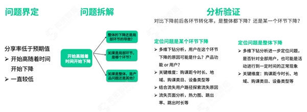 首先,判斷該問(wèn)題是整體的問(wèn)題還是局部的問(wèn)題。整體的問(wèn)題一般是什么原因?qū)е碌哪?如節(jié)假日影響、版本發(fā)布、產(chǎn)品 BUG、政策因素等,然后通過(guò)對(duì)比分享轉(zhuǎn)化漏斗各環(huán)節(jié)轉(zhuǎn)化率在下降時(shí)間點(diǎn)前后是否一直下降。整體的問(wèn)題一般影響面較大,通過(guò)核心維度下鉆可以定位,比如 Android/iOS,或是時(shí)間周期。一般情況下更多的是某個(gè)環(huán)節(jié)出現(xiàn)問(wèn)題。定位到具體環(huán)節(jié)后,再看是產(chǎn)品問(wèn)題還是用戶層面問(wèn)題。另外,從運(yùn)營(yíng)視角,可以去確認(rèn)是全部用戶的問(wèn)題還是局部用戶的問(wèn)題,這個(gè)通過(guò)核心維度下鉆可得知。
