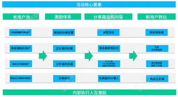 激勵(lì)體系:激勵(lì)體系是活動(dòng)“玩”起來(lái)的核心。確定激勵(lì)物是什么需要考慮和業(yè)務(wù)、目標(biāo)的貼合度,同時(shí)也需要考慮成本。比如素質(zhì)教育喜歡用課時(shí)來(lái)獎(jiǎng)勵(lì)購(gòu)買正價(jià)課的老用戶,或是給予虛擬幣用來(lái)購(gòu)買周邊;職業(yè)教育喜歡拼團(tuán)給予低價(jià)體驗(yàn)課,為正價(jià)課的轉(zhuǎn)化埋伏筆。對(duì)于公司具體應(yīng)該給用戶什么激勵(lì)這件事兒,我們建議本著不重復(fù)造輪子的原則,先參考同行,再根據(jù)效果成本進(jìn)行迭代。