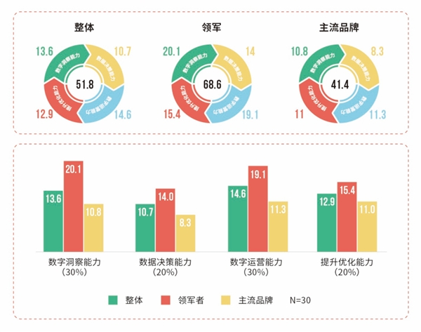 根據(jù)神策數(shù)據(jù)對(duì)新國貨美妝品牌數(shù)字化運(yùn)營成熟度評(píng)估的指標(biāo)解讀發(fā)現(xiàn):國貨美妝整體數(shù)字化營銷能力處于中游水平,各領(lǐng)域均有較大提升空間;領(lǐng)軍者在模型各方面均較領(lǐng)先,其中【數(shù)字洞察能力】和【數(shù)字運(yùn)營能力】是關(guān)鍵;主流品牌的數(shù)字化營銷能力還偏弱,主要體現(xiàn)在【數(shù)字洞察能力】上的建設(shè)力度不夠。